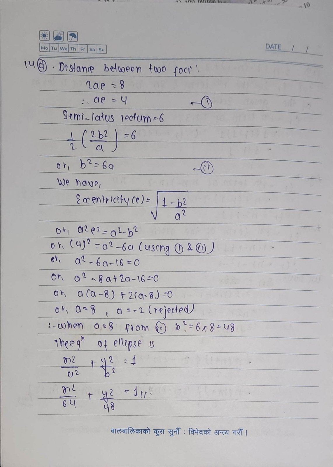 14. (a) Find the equation of ellipse in the standard form where distance between the two foci is 8 and the semi-latus rectum is 6.